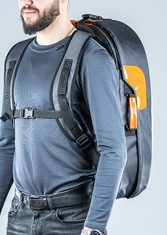 During operational transportation, the machine can be placed in a backpack with a detachable compartment for storing electrical components, or carried using a carrying strap (supplied upon request).